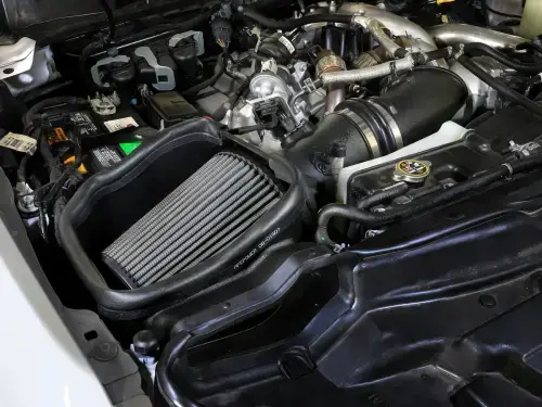 The included massive air filter is surrounded by an open-element XLPE (cross-linked polyethylene) polymer housing that minimizes warm engine air for maximum performance. Its open design allows for easy viewing of the air filter and delivers an aggressive Air Intake sound. It utilizes the vehicle's OE air inlet with no additional hardware.