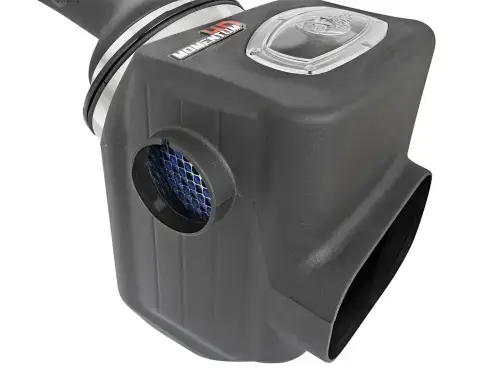 The Momentum HD intake is designed around a massive 1,000cfm performance 360 degree radial flow air filter with 10-layers of progressive cotton media providing 99.59% cumulative efficiency (independently tested). The unique air filter to housing interface (patent pending) allows for maximum filter size which increases the available air volume while simplifying the installation process. The air filter is wrapped in reinforced metal providing maximum strength to prevent filter collapse.