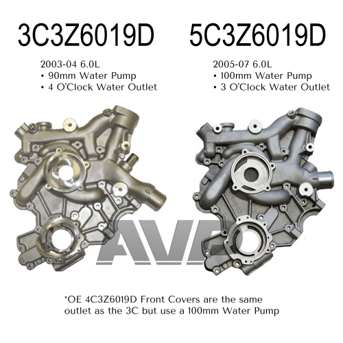 There are three Ford 6.0L front engine covers (International uses a different one altogether). 3C3Z (03'), 4C3Z(04') and 5C3Z(05'+).