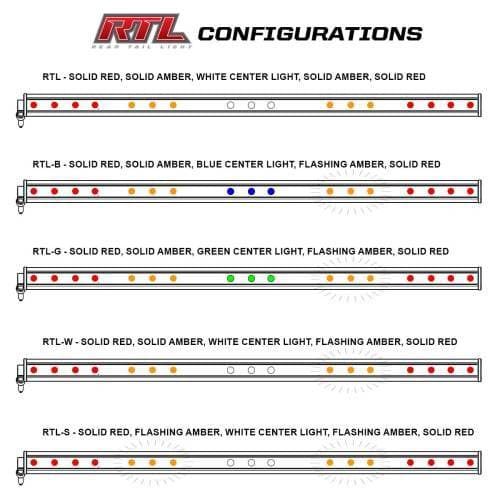 RTL-S: Solid Red, Flashing Amber, White Center Light, Flashing Amber, Solid Red (amber sections offer individual controls or can be configured to function as turn signals for on-road driving when paired with an external flasher or an sPOD/similar switch panel unit)