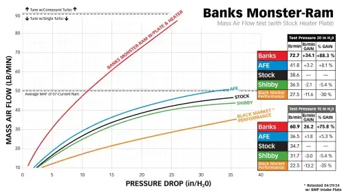 The Monster-Ram improves airflow from the intercooler. It flows 72.7 lbs/min MAF (Mass Air Flow) with Banks’ High-Flow Heater and Billet Intake Plate compared to stock's 38.6 lbs/min MAF.
