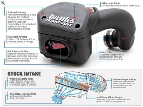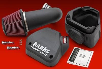 Banks Ram-Air Intake System replaces the factory's flat panel filter with a large conical lifetime filter that provides maximum high-flow filtration. The Ram-Air's opening dwarfs the stock's inlet. The huge inlet, enclosed housing and much larger tubing reduce restrictions, dramatically improving airflow to the cylinders.