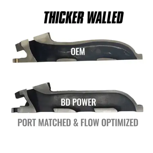 The 2011-2016 Ford 3.5L has an inherent design flaw where not all of the OE stud locations are utilized by the OE manufacturer which leads to warped exhaust manifolds, broken exhaust studs and blown manifold gaskets. The cylinder head on Fords 3.5L Gas Ecoboost has threaded holes for 11 exhaust studs to be used, however the OE manifold only utilizes 8 of those stud locations. BD has designed a manifold that not only utilizes all 11 stud locations, but also improves exhaust flow and has improved durability, the way it should have come from the factory. BD's Ford 3.5L exhaust manifolds are made from thicker-walled high silicone ductile iron designed to resist thermal warping. Each kit includes 22 exhaust spacers and 22 class 8.8 studs designed to further improve thermal durability.