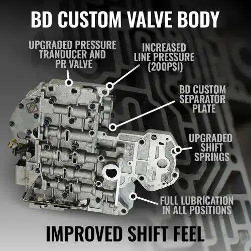 BD Diesel Roadmaster 47RE Transmission & Converter Package for Dodge/Ram 5.9L Cummins (4WD) Fully remanufactured 47RE transmission featuring the BD Valve Body! The BD Valve Body has many modifications to improve shift quality and extend transmission life. The RoadMaster transmission also includes a deep sump oil pan for increased fluid capacity and cooling. Combining the upgraded VB with increased line pressure and a ProForce torque converter, the BD Roadmaster 47RE transmission is a reliable upgrade for stock or mildly upgraded 5.9L Cummins-equipped Dodge Ram 2500/3500 series trucks.