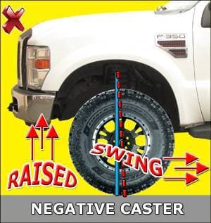 Alterations like installation of a suspension lift or leveling kit can cause the steering pivot axis and tire position to swing rearward resulting in negative castor. This results in wandering, wobble, pulling and stiff steering. Even larger tires can exaggerate the problem and require more positive castor adjustment than the stock truck is capable of.