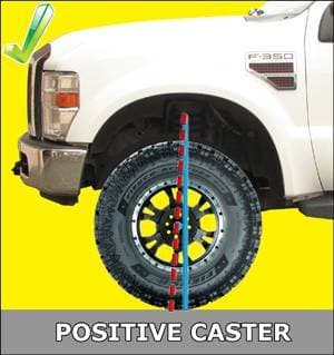 Caster is the angle to which the steering pivot axis is tilted forward or rearward from vertical, as viewed from the side. If the pivot axis is tilted backward (that is, the top pivot is positioned farther rearward than the bottom pivot) then the caster is positive; if it's tilted forward then the caster is negative. Conventional steering systems are designed with a positive caster angle to achieve good self-centering of the wheels while driving.