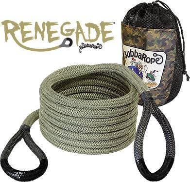 Meet the new generation of kinetic energy recovery rope in a compact size. With 100% more stretching ability and more pulling power than a flat web strap, Renegade is the perfect tool for safely snatching Jeeps and light trucks from mud, sand or snow. We even made it Military Camo green to match the military specs that this rope was derived from. Mesh duffle bag and camo Velcro wrap included.