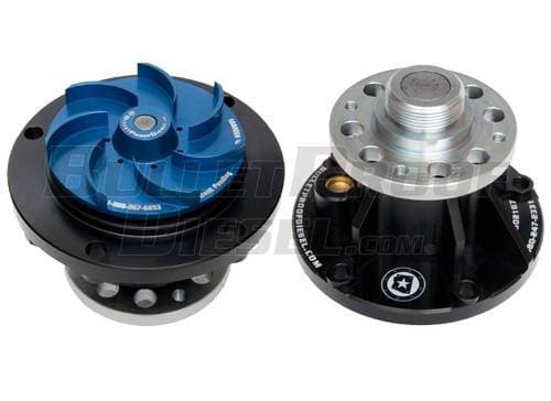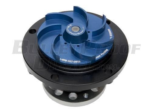 Bullet Proof Diesel's answer to the 6.0L water pump failure. •Billet Aluminum Impeller •Great Fit and Function •Prevents cracked plastic impeller failure •O-ring seal included •For trucks with round EGR coolers The Bullet Proof Diesel Billet Water Pump is designed for maximum durability. It features an aluminum impeller in place of the OEM plastic impeller, top of the line bearing assembly, top-grade seal and an all-billet precision machined housing. This stronger impeller resists cracking along the hub helping to prevent impeller failures, overheating engines and expensive repairs. The aluminum impeller is also stiffer and stronger and therefore less likely to flex under heavy loads, leading to less cavitation and less erosion within the front cover. The billet housing is strong and more precise than a typical water pump cast housing.