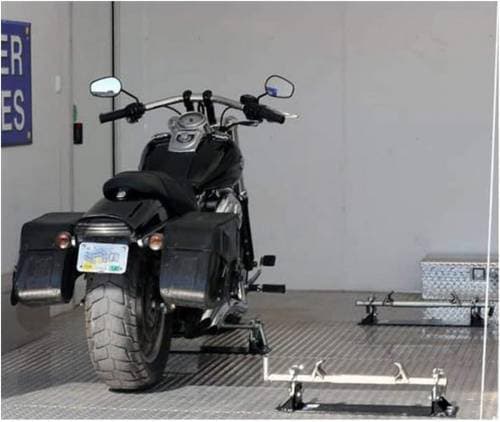 Holds the motorcycle upright with no movement. A standard wheel chock may be used if desired.