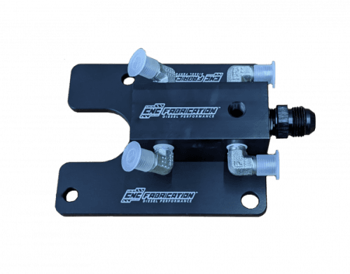 CNC Fabrication 4-Line Feed Valley Mount Fuel Line Kit for Ford 7.3L Power Stroke, Valley Mount, OBS (Red) This kit is for the DIY person wanting to convert their truck to an electric fuel pump system. Pump, regulator, and filters will need to be purchased. •Meant for installation with factory or aftermarket drop-in style turbos to convert to an E-fuel system •Great for all injectors sizes from stock to competition •High quality billet T-6061 aluminum machined in house •Upgraded with aerospace/military grade high flow Genuine Brennan™ compression fittings •Eliminates many leak points from the stock factory fuel pump and fuel bowl •Base plate and distribution manifold are pre-assembled for easier installation •All lines are made of mandrel bent 304 Sandvik Coromat seamless stainless steel tubing •Every single kit is test fit during production to ensure perfect fitment •Comes with all necessary fittings, o-rings for turbo pedestal, bolts, and freeze plug for a complete install. •Test port to measure/set fuel pressure •1/2" AN (-08) inlet for plenty of volume of fuel for unlimited size injectors •Lines are bent right here in our shop on our state of the art 3 axis CNC tubing bender for a perfect fit every time **For Early '99 ONLY, select the Fuel Bowl Relocation Kit from the drop-down menu as an affordable option over a FASS or AirDog fuel pump setup that will retain your factory fuel pump** You can also build your own pump setup if you like. We recommend using a stock Superduty Bosch pump for stock to 160/30 injectors, the AEM 400lph pump for mild built trucks for above 160/30 to 250/100 injectors, or the Fuelab Prodigy pumps for competition running 300cc or larger. We also recommend using Fuelab adjustable regulators. For a more plug-n-play type fuel pump/filter setup we recommend the AirDog II 5G Fuel Pump as it has the filters and regulator built in, a lifetime warranty (as long as you turn in your receipt within 30 days of purchase), and is simple to install. The only thing you need to do with the AirDog II 5G with an OBS is to cut off the "mini fuse tap" wire that is meant for the 99 and newer trucks to an "ATO (regular) fuse tap" for key-on power to send power to the supplied relay, and install the pump as directed by AirDog.