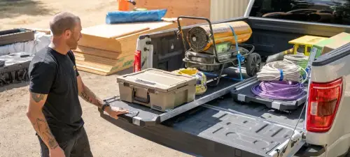 The toughest and most durable bed slide on the market. Built from heavy gauge, powder coated American steel and industrial grade marine plywood (coated with a thermoplastic top sheet), the CargoGlide truck bed slide can take all of the use and abuse of the jobsite and the environment. Load it up with compressors, welders, tool boxes, you name it. All of your work items slide right out to you every time.