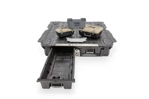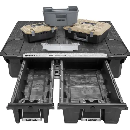 DECKED Truck Bed Storage Drawers & Base Accessory Pack for Dodge/Ram 1500 w/ Rambox (6 FT 4 Inch Bed) Providing secure, weatherproof and organized storage for full-size pickup trucks, the DECKED Drawer System features two lockable, full bed-length drawers capable of carrying 200lbs each. Evenly distributed, the system has a 2,000lb payload-rated deck. Each system includes: 1 Tan Sixer 16 D-Co case, 1 Tan Halfrack 32 D-Co Case, 1 vX Drawerganizer, 2 vX Drawer Dividers, 4 DECKED D-rings, 2 Deep Stash Bins & 2 Shallow Stash Bins. Decked in-vehicle storage systems make it possible for you to work smarter and play harder. These innovative units feature two full bed-length drawers (each with a 200 lb. load rating and cast aluminum handles) that roll out to provide ergonomic access to tools, equipment, and gear—while also providing full use of your truck bed or cargo van. The deck sits just above the wheel wells and offers a true 2,000 lb. payload rating. Decked systems are crafted from high-density polyethylene (HDPE) co-molded to galvanized steel subframes, making them super-rugged and strong. Decked products are designed to live outside in the elements; the exterior will be unaffected by extreme shifts in temperatures, moisture levels, or intense UV exposure. Dozens of models are available for precise fitment in your truck bed application.