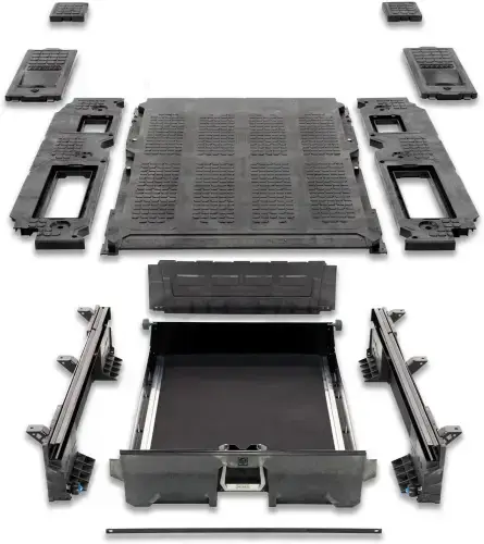DECKED Truck Bed Storage Drawers & Base Accessory Pack for Nissan Frontier w/ Decked Out Package (6 FT 1 Inch Bed) Providing secure, weatherproof and organized storage for full-size pickup trucks, the DECKED Drawer System features two lockable, full bed-length drawers capable of carrying 200lbs each. Evenly distributed, the system has a 2,000lb payload-rated deck. Each system includes: 1 Tan Sixer 16 D-Co case, 1 Tan Halfrack 32 D-Co Case, 1 vX Drawerganizer, 2 vX Drawer Dividers, 4 DECKED D-rings, 2 Deep Stash Bins & 2 Shallow Stash Bins. Decked in-vehicle storage systems make it possible for you to work smarter and play harder. These innovative units feature two full bed-length drawers (each with a 200 lb. load rating and cast aluminum handles) that roll out to provide ergonomic access to tools, equipment, and gear—while also providing full use of your truck bed or cargo van. The deck sits just above the wheel wells and offers a true 2,000 lb. payload rating. Decked systems are crafted from high-density polyethylene (HDPE) co-molded to galvanized steel subframes, making them super-rugged and strong. Decked products are designed to live outside in the elements; the exterior will be unaffected by extreme shifts in temperatures, moisture levels, or intense UV exposure. Dozens of models are available for precise fitment in your truck bed application.