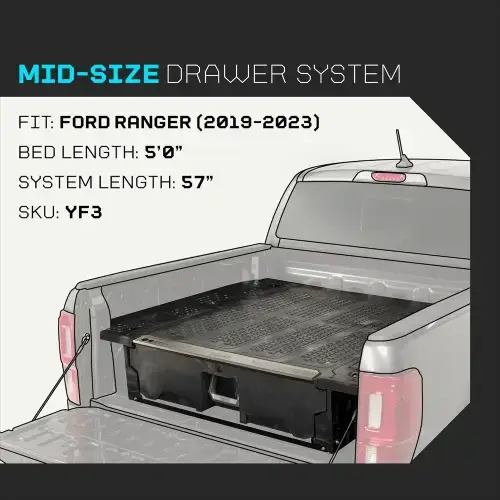 DECKED Truck Bed Storage Drawers & Base Accessory Pack for Nissan Frontier w/ Decked Out Package (6 FT 1 Inch Bed) Providing secure, weatherproof and organized storage for full-size pickup trucks, the DECKED Drawer System features two lockable, full bed-length drawers capable of carrying 200lbs each. Evenly distributed, the system has a 2,000lb payload-rated deck. Each system includes: 1 Tan Sixer 16 D-Co case, 1 Tan Halfrack 32 D-Co Case, 1 vX Drawerganizer, 2 vX Drawer Dividers, 4 DECKED D-rings, 2 Deep Stash Bins & 2 Shallow Stash Bins. Decked in-vehicle storage systems make it possible for you to work smarter and play harder. These innovative units feature two full bed-length drawers (each with a 200 lb. load rating and cast aluminum handles) that roll out to provide ergonomic access to tools, equipment, and gear—while also providing full use of your truck bed or cargo van. The deck sits just above the wheel wells and offers a true 2,000 lb. payload rating. Decked systems are crafted from high-density polyethylene (HDPE) co-molded to galvanized steel subframes, making them super-rugged and strong. Decked products are designed to live outside in the elements; the exterior will be unaffected by extreme shifts in temperatures, moisture levels, or intense UV exposure. Dozens of models are available for precise fitment in your truck bed application.