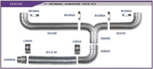 Diamond Eye Performance 5" aluminized dual stack bed kit. This system comes with everything you need to mount a pair of 5" OD inlet stacks to your current 4" under bed exhaust. If you're a true purist and love the sound of a set of stacks rumbling down the highway and smoke billowing over the cab, then this stack kit from Diamond Eye is what you've been waiting for.