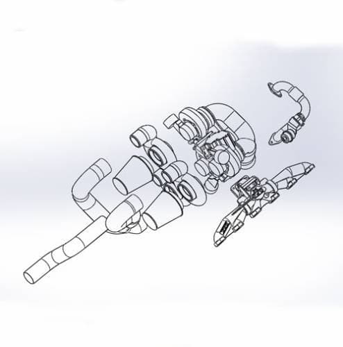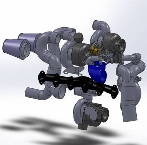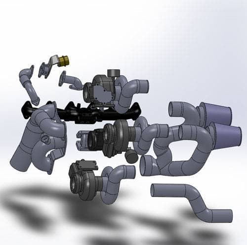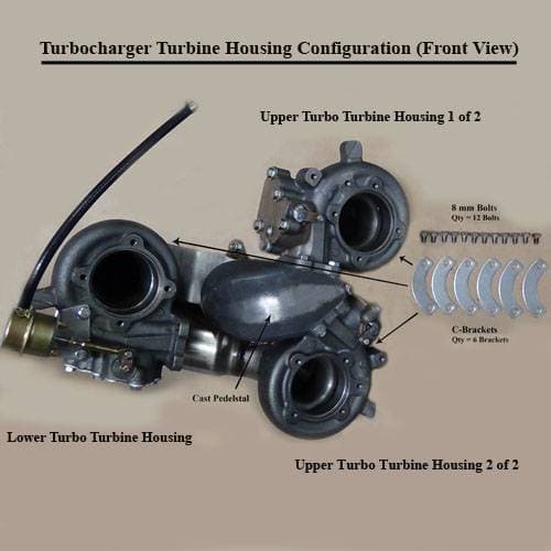 Unlike other kits on the market that simply mount the parallel turbos to a pipe with a flange, which creates huge turbulence, our kit comes with a cast iron 'Y' pedestal, which splits the exhaust very efficiently into the two parallel turbos. This system was designed on a computer using the latest CAD and CFD (computational fluid dynamics) software to achieve excellent, efficient air flow throughout the system, as well as excellent pairing of turbo wheel sizes together. All exhaust fittings to the turbos are bolted on, not v-band clamped so there is no exhaust leaks.