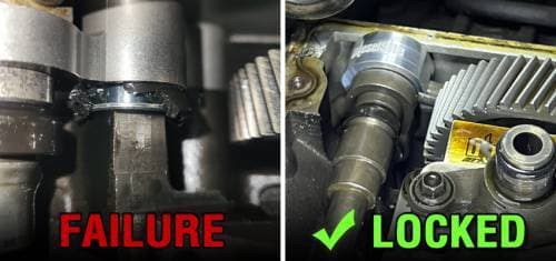 Installation involves removing the high pressure oil pump (HPOP) cover, slipping the line lock over the branch tube hex and then tapping into place until it seats. It is machined to be a perfect fit over the branch tube hex, aligning with the branch tubes and grommet bolt and will only seat in one position. The cover prevents the lock from ever unseating or lifting after installation so it cannot drop into the motor.