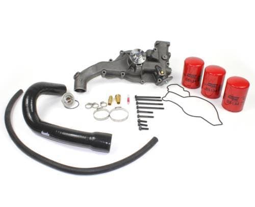 *We offer a dual alternator coolant hose for this kit as an add-on to overcome the poor design of the stock coolant hose going through the serpentine belt, but this pump will not fit onto a dual alternator setup. The second alternator is physically in the way. If your truck uses do not require the second alternator, it is possible to remove the second alternator and install this water pump. You would also have to install the proper belt.