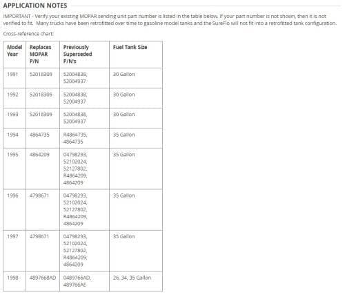 IMPORTANT - Verify your existing MOPAR sending unit part number is listed in the table below. If your part number is not shown, then it is not verified to fit. Many trucks have been retrofitted over time to gasoline model tanks and the SureFlo will not fit into a retrofitted tank configuration. For Model Year 1998 trucks equipped with a 12 valve engine - your vehicle will require our 1998-2002 SureFlo (FPE-SF-CUMM-9802). These trucks would have been originally equipped with Carter sending unit part number 52102079AB.