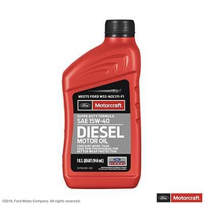 •Motorcraft® SAE 15W-40 Super Duty Diesel Motor Oil is a high-quality light and heavy-duty diesel engine oil recommended by Ford Motor Company. It is particularly recommended for use in Ford vehicles equipped with Power Stroke® Diesel engines, as well as in other diesel engine applications where the manufacturer recommends an oil of this viscosity grade and quality. It meets Ford WSS-M2C171-F1, required for use in Power Stroke® Diesel engines designed to meet 2017 on-highway exhaust emission standards and requiring ultralow sulfur diesel fuel as well as meeting the requirements for previous model year diesel engines.