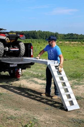 These foldable aluminum loading ramps are a multi-piece ramp system designed for loading vehicles or other wheeled equipment onto docks, trucks, or trailers. Their lightweight aluminum construction makes them lightweight and portable without sacrificing any toughness! Plus these fold from 8′ to 4′ and can be stored in a short bed truck!