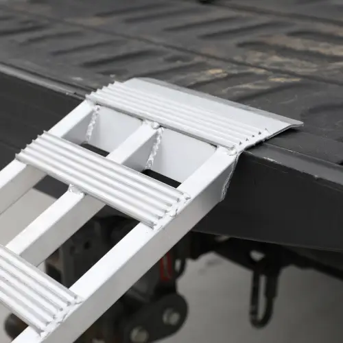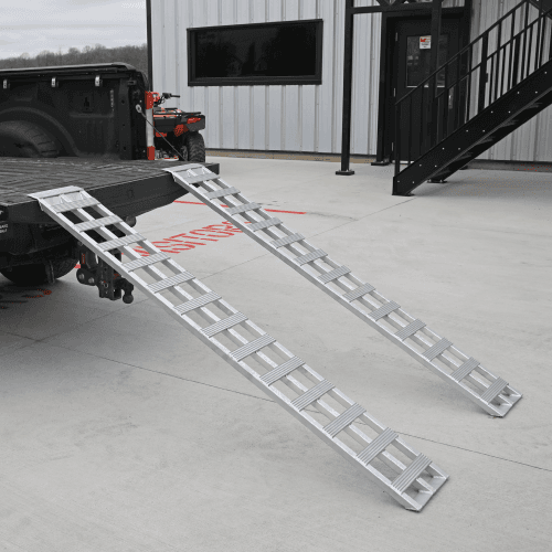 These lightweight aluminum loading ramps are a multi-piece ramp system designed for loading lightweight ATV’s, dirtbikes and more! These portable aluminum ramps are a great solution for all of your loading and unloading needs. These ramps provide support as well as excellent traction due to their textured cross-patterns. This provides extra support and safety for wet and/or muddy tires.