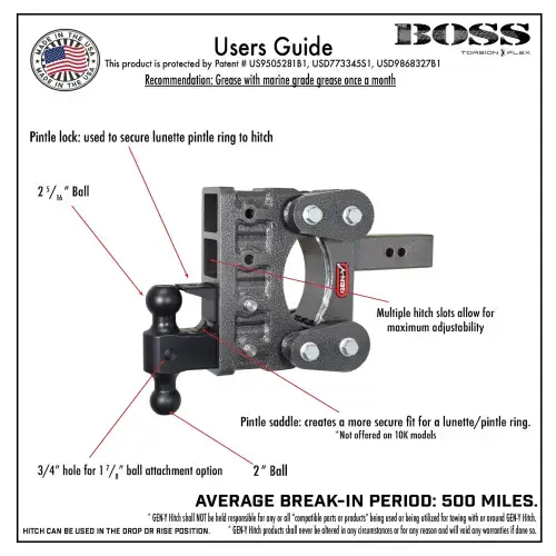 All GEN-Y Hitch products are rigorously tested and exceed the SAE-J684 Weight Testing Requirements. Never exceed recommended capacity on any trailer tow coupling or vehicle receiver hitch. Patents protecting the GEN-Y Boss (Torsion-Flex) 16K drop hitch include #(s) US9505281B1, USD773345S1, USD9868327B1