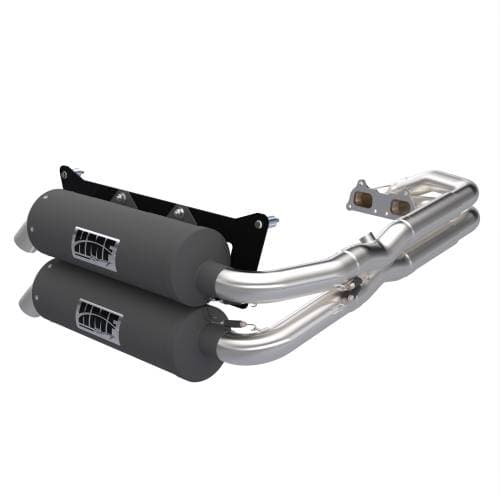 HMF Exhaust Systems for Polaris RZR XP 1000, Titan Quiet Series, Dual Full System, Grey - Gun Metal, Billet, Blackout End Cap Enhance your Polaris RZR XP 1000's performance with HMF Racing's Titan Series exhaust systems. Available in Slip On and Dual Full System options, these exhausts don't just enhance sound quality—they deliver substantial power gains across the RPM range. Experience heightened engine performance and a richer exhaust sound, elevating your off-road adventures to new levels. There is a 2-4 dB decrease in sound levels with Quiet Core Inserts installed on all systems.