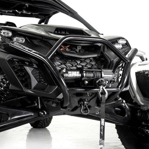 HMF HD Front Bumper for Can-Am Maverick R, Silver Upgrade your Can-Am Maverick R with the rugged HMF HD Front Bumper. Engineered from heavy-duty .095" steel DOM tubing, this bumper offers robust protection for the front end of your Maverick R. The integrated winch plate can accomodate winches up to 6000lb, or act as a light mount to accommodate LED light bars up to 10", or (2) 4" square LED lights. For your winch location, you can either keep the winch in its factory position, or you can mount it higher on the HMF HD Bumper for easier access and to keep it out of the mud. The HD Bumper is available in 6 durable, UV-resistant powder coated colors that seamlessly match the stock color schemes on the Maverick R. Whether you’re navigating rocky terrains, tackling muddy trails, or simply upgrading your machine, the HMF HD Bumper delivers increased functionality in a sleek, aggressive design. Designed to provide extreme support, the HMF HD Exo Front Bumper adds even more protection. Acting as an exoskeleton, the HMF Exo HD Front Bumper uses rugged .095" steel DOM tubing to add additional protection and support.