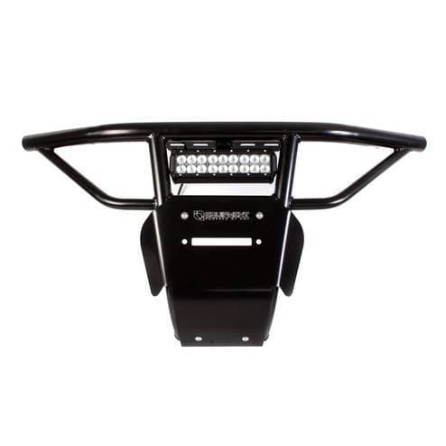 HMF HD Front Bumper for Polaris RZR XP/4 1000, Raw This HD Front Bumper is a versatile bumper fitting multiple Polaris RZR models. Offering increased front end protection, this bumper is constructed from .095” wall steel tubing and includes a 3/16” aluminum skid plate with a cutout for standard UTV fairleads with 6” mounting hole spacing. This allows for the use of winches mounted in the stock location on the RZR while also providing protection for the winch itself. An integrated light mounting plate is welded along the top bar for even more versatility.