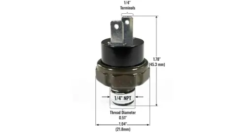 With our 1/4" NPT Pressure Switch, your compressor will automatically turn on when it detects your air pressure has dropped below the pressure range specified on the switch and automatically shut off when the tank reaches the desired pressure. This pressure switch is compatible with both 12-volt and 24-volt applications, making it the perfect addition to any air compressor system.