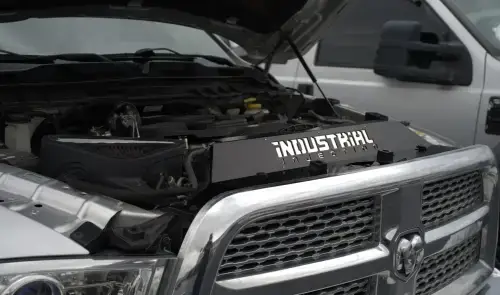 Introducing the Industrial Injection Radiator cover for your 2013-2018 RAM 2500/3500 with Cummins engine! Say goodbye to the factory flimsy rubber radiator cover that is prone to wear and tear, and upgrade to our premium aluminum cover. Made with heavy-duty .090 gauge aluminum, this radiator cover is built to last. Not only does it provide added protection for your radiator, but it also features a sleek laser-cut Industrial Injection logo, adding a touch of style to your engine bay. Installation is a breeze with no drilling required, and all necessary hardware is included. This radiator cover also upgrades your factory Radiator Upper Seal Part to 55371021AA. Give your RAM the protection and style it deserves with the Industrial Injection Radiator cover.