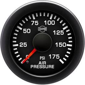 Isspro Performax Air Pressure Gauge is calibrated to 0-175 PSI with a black face, red pointer, black bezel, and green lighting. Isspro EV2 electric gauges are built with microprocessor-controlled stepper motor movements, LED back lighting, precision senders, and sweep 270 degrees.