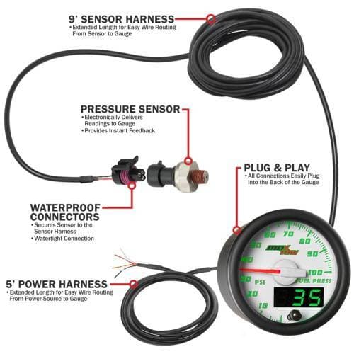 MaxTow’s Double Vision White & Green 100 PSI Fuel Pressure Gauge is an electronically driven truck gauge that includes an electronic fuel pressure sensor which reads and displays levels from 0 to 100 PSI with unrivaled accuracy. This diesel fuel pressure gauge ensures your fuel system’s pressure is running at optimal levels, and is not too low which could result in loss of horsepower and damage to your fuel pump or injectors. Get ready to hit the road and Tow to the Max.