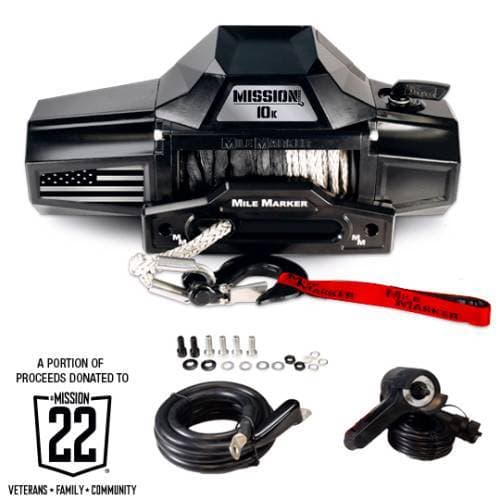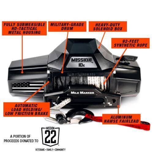 Mile Marker Mission Winch Flag Series, 10,000 Pound (Patriot Edition) Built for strength, precision, and pride, the Mile Marker Mission Series Winch Flag Edition combines rugged performance with patriotic spirit. Engineered for reliability in the harshest conditions, it delivers unmatched pulling power and control. Whether tackling trails, work sites, or recovery missions, this winch stands ready—power, durability, and heritage in one. Mile Marker is pleased to have partnered with Mission 22, a national community that stands beside our Veterans and their families. A portion of the proceeds for every Mission Flag Series winch will be donated to Mission 22 as a token of our gratitude for these heroes and their families.
