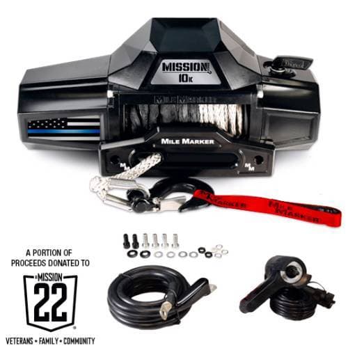 Mile Marker Mission Winch Flag Series, 10,000 Pound (Thin Blue Line Edition) The Mission Series Winch Thin Red Line Flag Edition is built to honor the bravery of firefighters and first responders while delivering Mile Marker’s proven performance. With rugged power, precision engineering, and long-lasting durability, this winch stands as a symbol of resilience—crafted for recovery, adventure, and anyone driven by courage and service. Mile Marker is pleased to have partnered with Mission 22, a national community that stands beside our Veterans and their families. A portion of the proceeds for every Mission Flag Series winch will be donated to Mission 22 as a token of our gratitude for these heroes and their families.