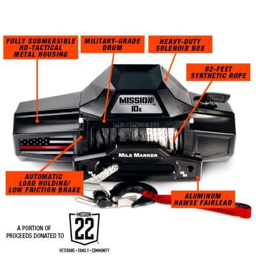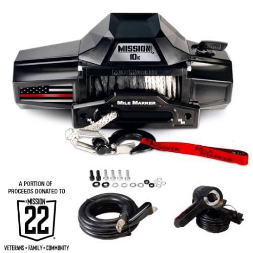 Mile Marker Mission Winch Flag Series, 10,000 Pound (Thin Red Line Edition) The Mission Series Winch Thin Red Line Flag Edition is built to honor the bravery of firefighters and first responders while delivering Mile Marker’s proven performance. With rugged power, precision engineering, and long-lasting durability, this winch stands as a symbol of resilience—crafted for recovery, adventure, and anyone driven by courage and service. Mile Marker is pleased to have partnered with Mission 22, a national community that stands beside our Veterans and their families. A portion of the proceeds for every Mission Flag Series winch will be donated to Mission 22 as a token of our gratitude for these heroes and their families.