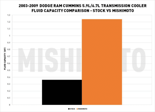 There’s no greater enemy for a transmission than heat. Whether your 2003–2009 Dodge Ram 5.9L/6.7L Cummins is a dedicated tow vehicle, hardworking fleet truck, or a daily driver with a liking for the dragstrip, you need to ensure that your transmission runs cool. Luckily, Mishimoto has developed a direct-fit transmission cooler to do just that. Our 2003–2009 Dodge Ram 5.9L/6.7L Cummins transmission cooler utilizes a stacked-plate core for durable and powerful cooling. With a massive 212% greater core volume and 244% increase in fluid capacity, this trans cooler is a huge improvement over the stock 2003–2009 Dodge Ram 5.9L / 6.7L Cummins transmission cooler.