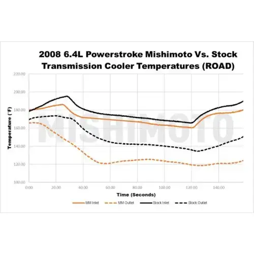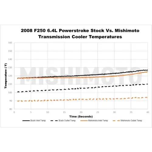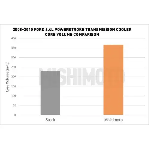 Heavy loads are no match for a 2008-20010 Ford 6.4L Powerstroke equipped with the Mishimoto 6.4L Transmission Cooler. The Ford 6.4L Powerstroke is renowned for its towing capabilities, with up to 16,000 lbs of towing capacity, It's certainly no slouch. But every powertrain has its limits. With the Mishimoto 6.4L Powerstroke transmission cooler, you?ll be able to push those limits knowing that your transmission is protected. The 17-row stacked-plate cooler provides a 121-percent larger surface area over stock and increases core volume by 63-percent. That all adds up to a road and dyno-proven 20F drop in transmission fluid temperature at the cooler outlet. No modifications are necessary for installation, and, just like all Mishimoto 6.4L Powerstroke parts, this cooler comes with the Mishimoto Lifetime Warranty.