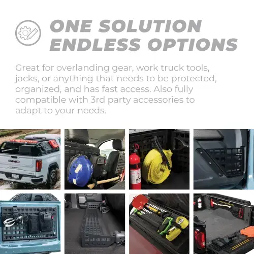 •Complete Coverage: Outfit your truck with MOLLE panels for the front bulkhead, driver side, passenger side, and tailgate. Choose individual panels or a complete kit for full bed organization and protection.