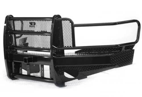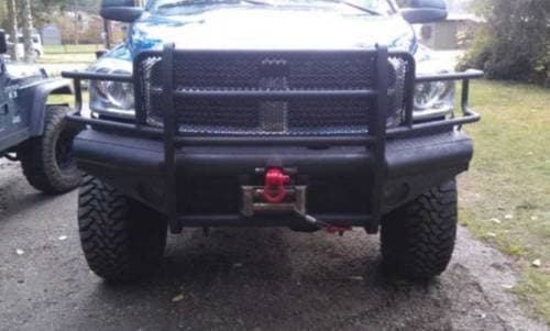 Fully welded one piece design for added strength and protection. 1/4" formed channel bumper with 2" receiver and 15K winch mount that fits WARN 16.5ti Thermometic, M15000, M12000, 9.5si M.O.S.F.E.T., 9.5ti, HS9500i, XD9000i, X8000i; Ramsey Patriot 9500, Patriot 8000, Patriot 6000; Mile Marker Hydraulic Winches, 8000 Electric, 9000 Electric, and 12000 Electric; and the following WARN winches require bracket number 26368, 9.5xp, HS9500, XD9000, M8000, M6000, TABOR 9K, and TABOR 12K. Wrap around loops are made of sturdy 12ga. tubing. Custom punch grille inserts. Adding a body lift will affect the fit of this product. Overall weight is 270 lbs.