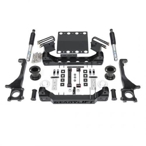 The key to this kit's success is our popular proprietary heavy-duty top mount offset strut extensions to gain a true 6 inches of front lift. Other great features that drastically improve handling and overall driving mannerisms are the precision engineered cast iron lift knuckles that provide perfect alignment geometry throughout the suspension cycle and the retention of hte factory sway bar mounting locations. You even get to keep the factory skid plate and gravel guard! This kit includes heavy-duty laser-cut, CNC-bent steel cross members to properly lower the front differential and maintain the structural integrity of the frame. For the rear we include 5 inch tall fabricated steel lift blocks teamed up with a pair o performance-tuned Bilstein 5100-series shocks.