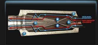 Hot exhaust gases entering the tapered inlet section are actually accelerated as they pass through the perforated cone into the outer core area. The perforation pattern and entry angle are specifically engineered into each product to provide optimum airflow characteristics. The sound energy is reflected and redirected back into itself as well as into the outer thermal core by the carefully selected taper angle of the entry cone.