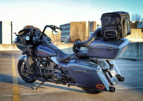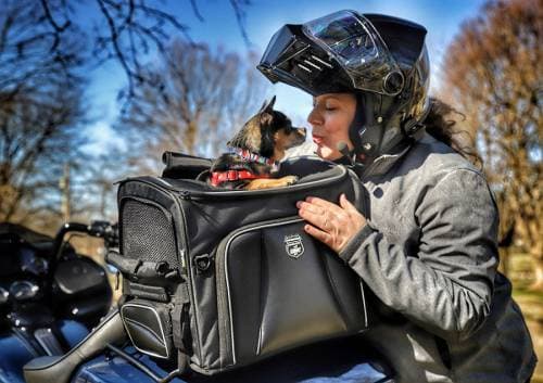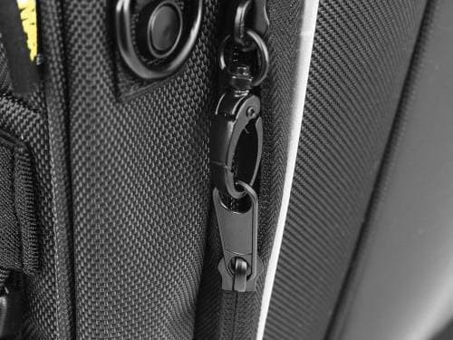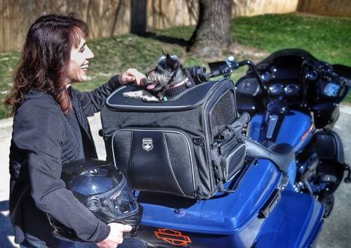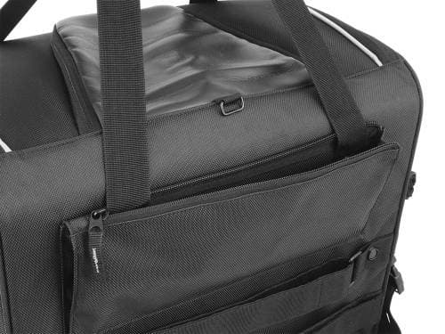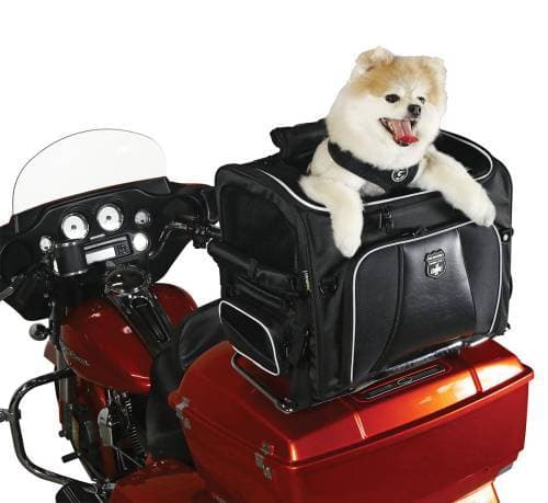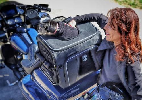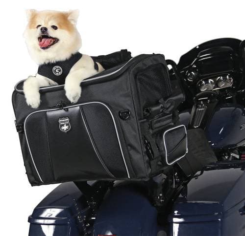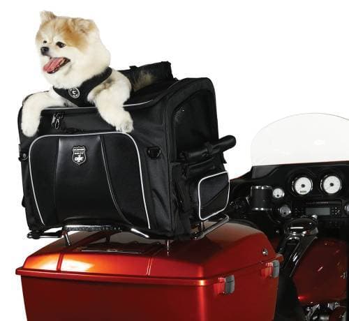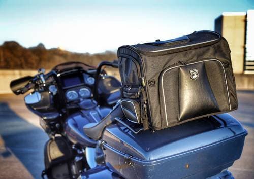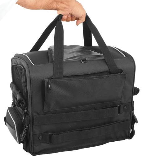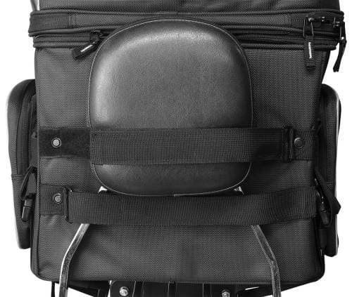 Mounts to tour trunk racks, sissy bar or seat using quick release and self-fastening straps