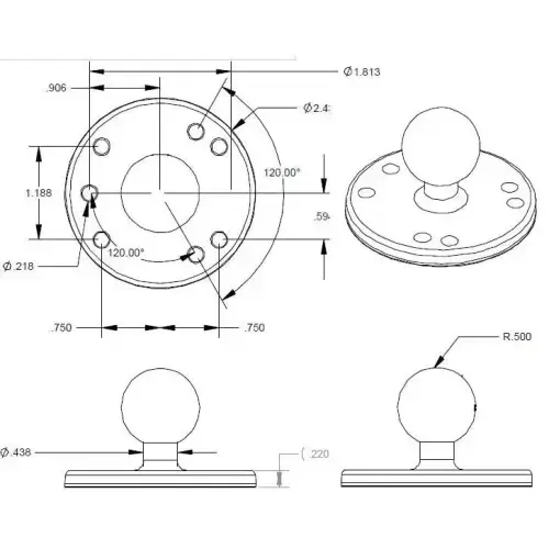 •.5" round plate connects to RAM® device holders containing the universal AMPS hole pattern