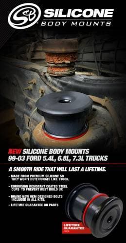 Stock body mounts deteriorate over time and cost a fortune. Urethane mounts are hard and squeak. S&B’s Silicone Body Mounts have a smooth stock ride and last the life of your truck.