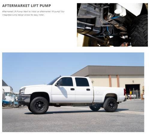 Note: This fuel tank fits 2001-2004 LB7 trucks only. 2004.5-up trucks with LLY, LBZ, and LMM engines use part # 10-1006.