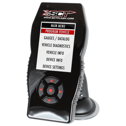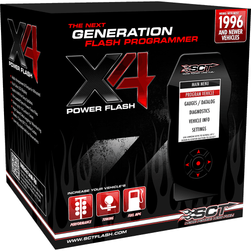 The X4 Power Flash arrives Pre-Loaded with proven tune files that INCREASE HORSEPOWER and TORQUE! Programming your vehicle with one of SCT's pre-loaded performance or fuel economy tune files is as easy as 1-2-3. Simply plug the OBDII connector into your vehicle's OBDII port, select the pre-loaded tune file using the simple to navigate menu and within minutes the X4 programs your vehicle.