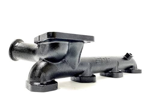 •Exhaust Manifold- Cast out of 600 series ductile iron. SPE’s design retains the original Hot-V principles of getting the heat and exhaust flow to the turbo as quickly as possible. SPE designed the manifold to operate with dual-volute T4 turbos. This manifold also has exhaust pulse optimization based on runner lengths and engine firing order, one major key to great turbo spool up. A factory EGT bung is also cast in.