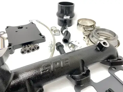 This turbo system does NOT require any extra components*. It can be used as a 100% drop-in replacement or as an upgrade. It uses the factory driver’s side manifold and an included, SPE designed, aftermarket passenger side manifold.